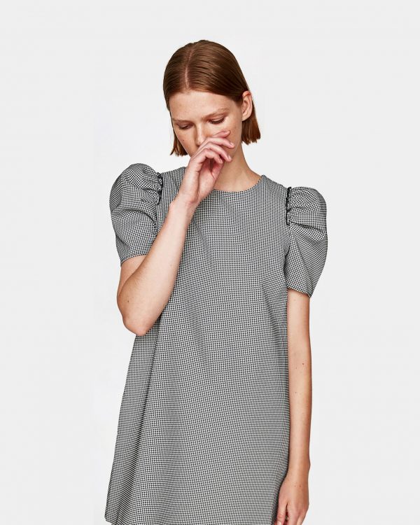 Shift dress from Ganni in Total Eclipse. Allover floral print. Round neckline. Concealed back zip closure. Long sleeves with black piping at cuff. Straight hem. Unlined. Casual fit.